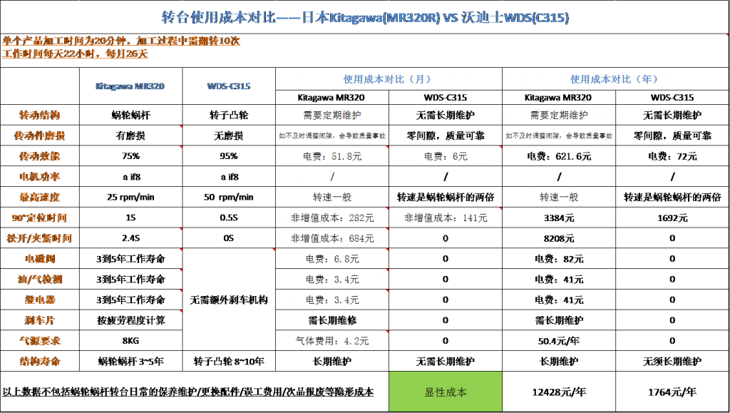 汽車配件行業(yè)一位客戶在試用沃迪士WDS-C315型號時(shí)將沃迪士第四軸產(chǎn)品與其原有的日本北川Kitagawa MR320R型號性能進(jìn)行了跟蹤和記錄,測試詳細(xì)結(jié)果如下表。沃迪士數(shù)控回轉(zhuǎn)臺以其獨(dú)特的滾子凸輪結(jié)構(gòu)在轉(zhuǎn)速、傳動效率和維護(hù)成本上展現(xiàn)了明顯的優(yōu)勢。